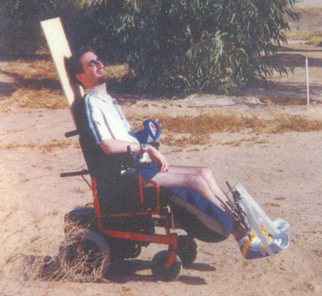 "Zest" sunning himself in his sweet power wheelchair on 2000’s January 21st.